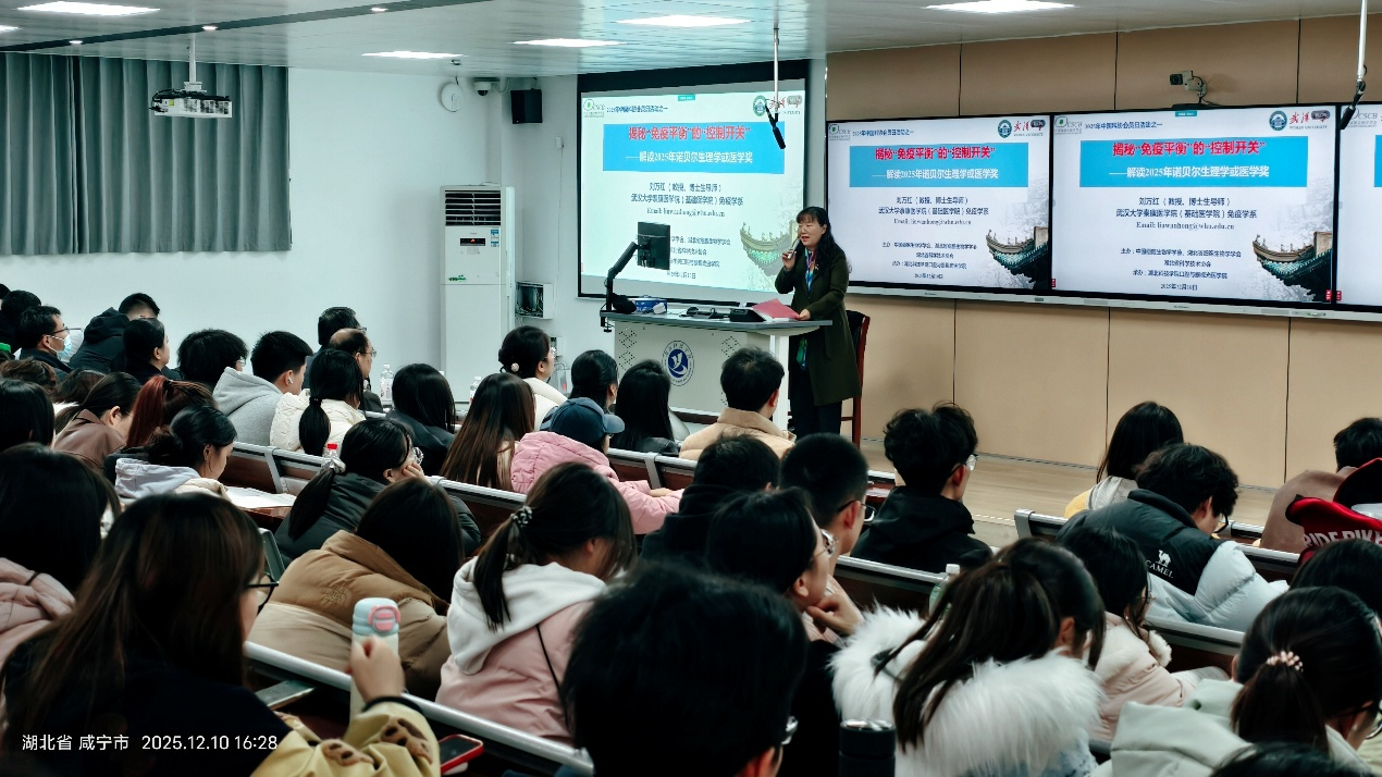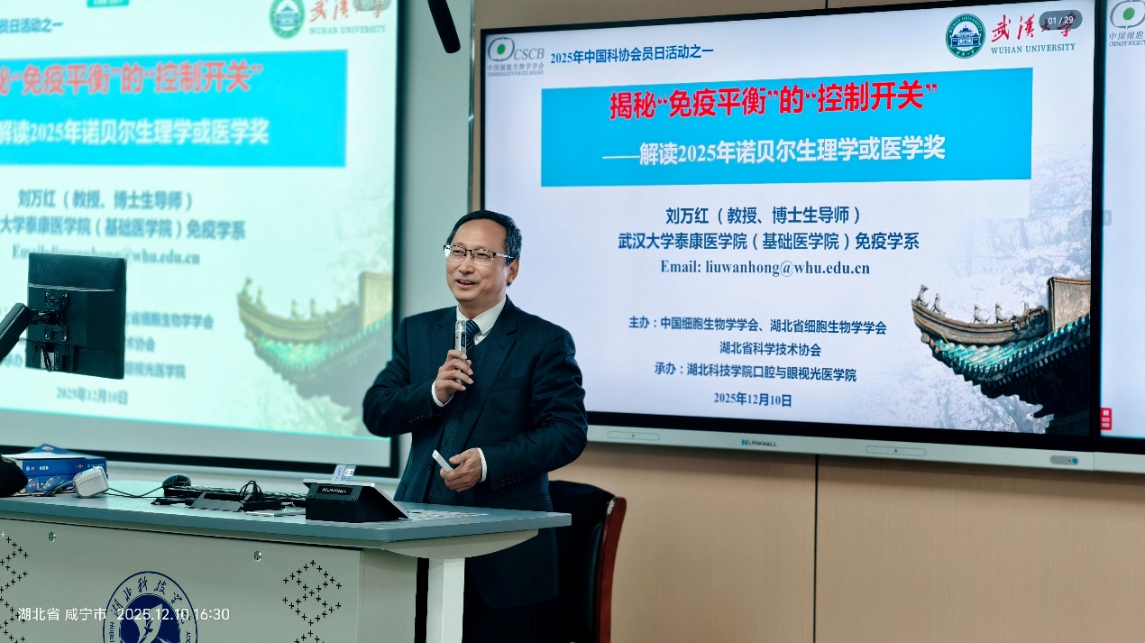 2025年12月10日下午,由中国细胞生物学学会指导,湖北省细胞生物学学会与湖北科技学院口腔与眼视光医学院联合举办的“揭秘‘免疫平衡’的‘控制开关’——2025年诺贝尔生理学或医学奖解读”科普讲座在我校成功举行。武汉大学泰康医学院(基础医学院)免疫学系刘万红教授担任主讲,湖北省细胞生物学会副理事长李文化教授代表学会出席活动,口腔与眼视光医学院院长周燕红教授主持讲座。